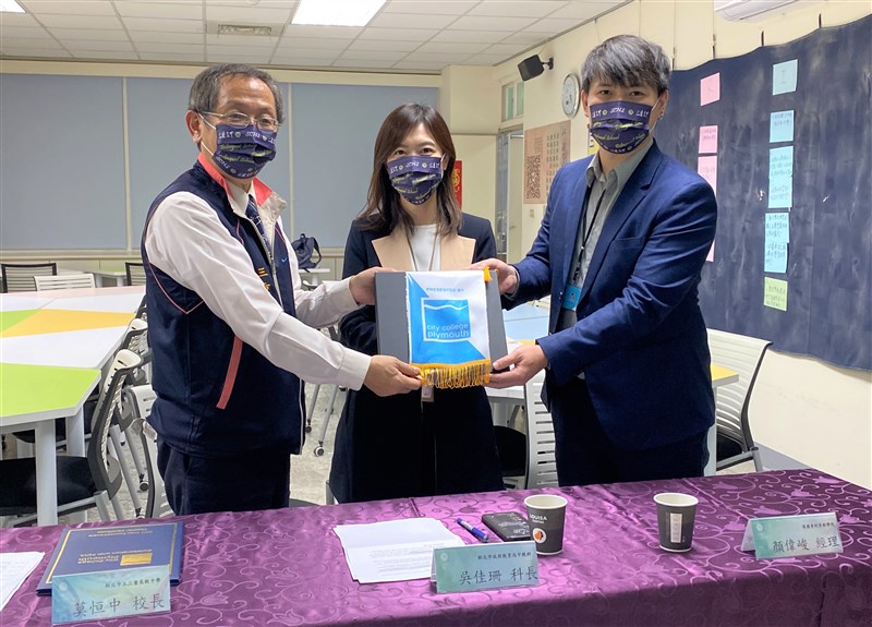 普利茅斯城市學院駐台灣辦公室顏偉峻經理(右一)致贈三重高中莫恒中(左一)校長紀念品。圖/新北教育局提供