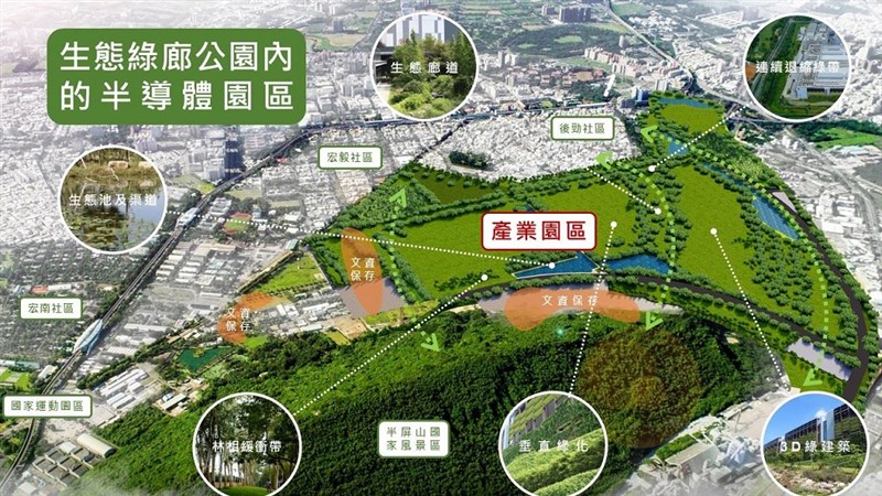 園區往北又可連結後勁溪、右昌公園等,往南連結半屏山國家風景區、蓮池潭、國家級洲仔濕地及柴山國家風景區,並透過綠色植栽延伸到雙湖公園、澄清湖、愛河流域等市區,建構不間斷的生態綠廊,帶來城市轉型與就業機會外,更會增加稅收,創造多贏局面。