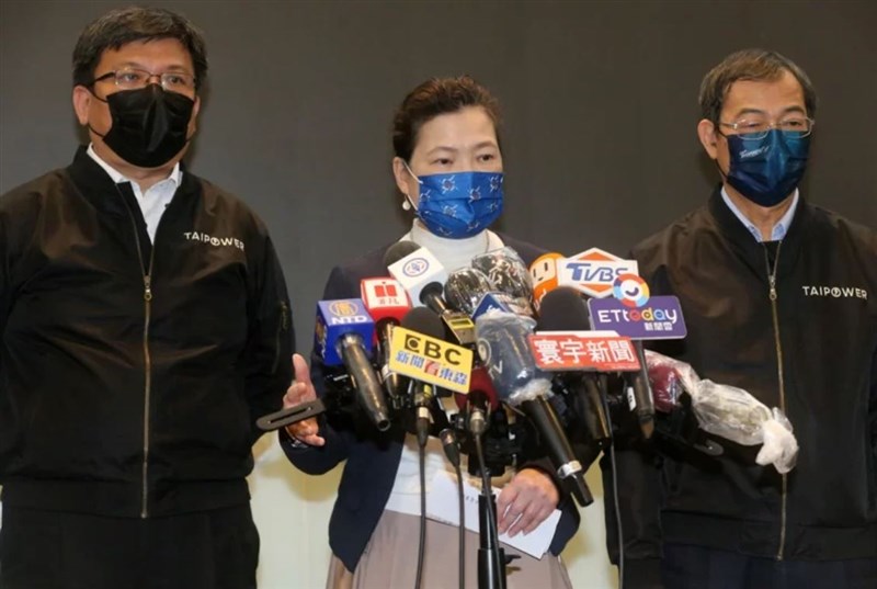 經濟部長王美花(中)在經濟部次長曾文生(左)、台電總經理鍾炳利(右)陪同下於台電舉行記者會,對大停電致歉。圖/胡經周