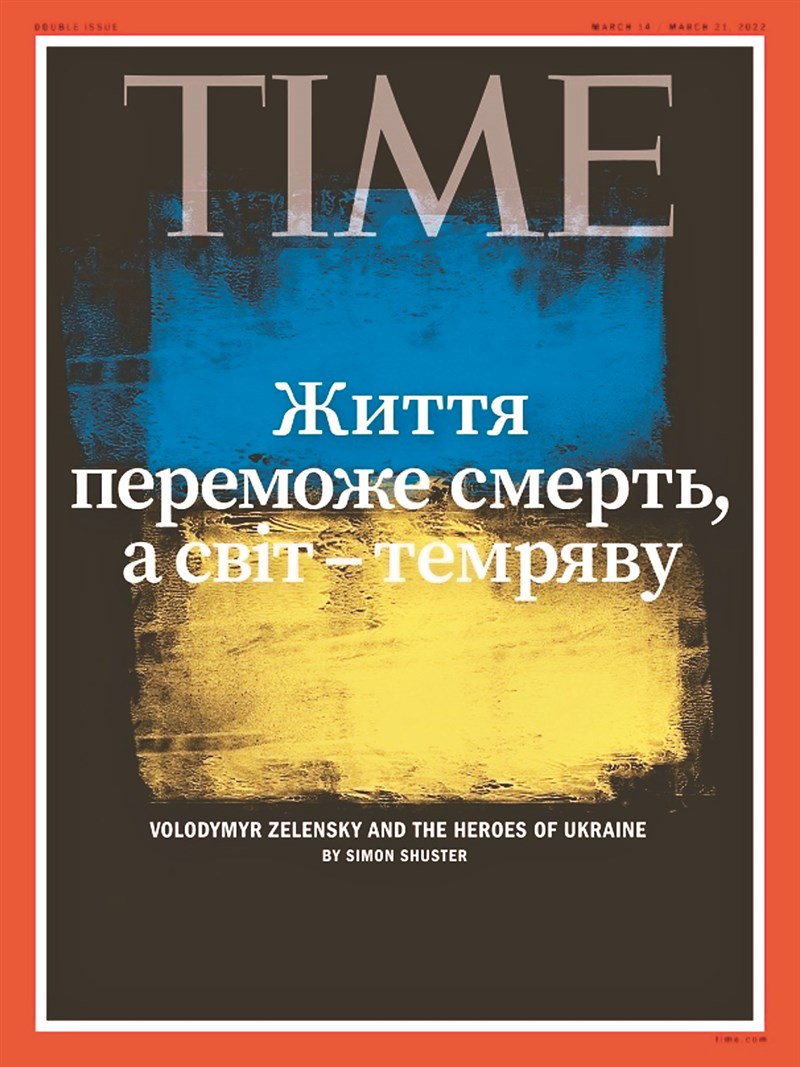 最新一期《時代》雜誌頭條為「澤倫斯基與烏克蘭的英雄們」,特地用烏克蘭文寫出澤倫斯基一日向歐洲議會演講時說出的「生命將戰勝死亡,光明將制伏黑暗」,封面故事讚揚他在俄羅斯侵略開始時,透過選擇留在首都基輔「改變歷史」,喚醒美國與盟邦對俄羅斯實施嚴厲制裁。