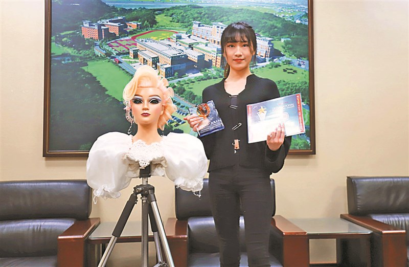 郭家彤獲OMC世界杯青年組新娘髮型金牌,她與作品合照。圖/育達科大提供
