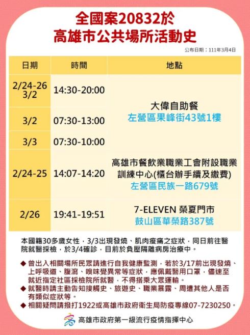 高雄1確診感染源不明 228連假全家曾到花東旅遊 |2022.03.04 語音朗讀 660觀看次 字級 大 中 小 高雄個案(案20832)感染源不明,曾跟家人去花東、屏東旅遊,縣府已展開相關足跡地點清消作業。圖/屏東縣政府提供 【本報台北訊】國內疫情趨緩,今(4)日新增2例本土個案,有1例為桃園個案,為桃園米迪幼兒園相關;1例為高雄個案,感染為待釐清。中央流行疫情指揮中心發言人莊人祥表示,這名待釐清個案(案20832)在快餐店工作,曾跟家人去花東旅遊,相關人員仍在匡列中。案20832為30多歲女性在自家餐店工作,3月3日出現發燒,到診所快篩呈現弱陽性,轉到醫院進行PCR陽性確診,Ct值為31,經過二採Ct降為20,感染源待釐清,被懷疑是社區黑數。莊人祥表示,個案曾在2月27日至3月1日跟家人有人去花東旅遊,目前採檢共8人有5位陰性,其餘3人檢驗中,還有21人待採中。圖/高市府提供莊人祥表示,針對社區有任何散發型病例出現,就會立刻進行疫調將疫情控制下來,由於Omicron非常容易感染,且被感染者是無症狀、容易散播,高雄個案感染源待釐清,「但不能說是社區黑數。」高市府公布該名確診者的足跡,包括左營果峰街大偉自助餐、高雄市餐飲職業工會附設職訓中心,以及7-ELEVEN榮夏門市。市府4日、5日在果貿里籃球場設社區篩檢站。高雄市長陳其邁說,衛生局觀察,這家自助餐熟客比較多,所以在實聯制部分落實的狀況比較不理想,如果足跡有重疊,或是曾到此自助餐店消費,請大家篩檢。圖/桃園市政府環保局提供至於米迪幼兒園相關個案(案20831)為40多歲男性,曾在2月27日採檢陰性,2月28日陪確診家人 (案20752)在家居家隔離,3月2日再採陰性,同天個案女兒確診,昨天再次安排採檢確診。莊人祥說,目前正在釐清個案是否更早之前就已經感染,昨天篩檢確診Ct值為36,血清N抗體陽性,顯示這個案是較早感染的。 前一篇文章 各國放寬防疫規定 約克維奇法網有望了 下一篇文章 北藝中心3月試營運受矚目 獲英國《金融時報》跨頁報導 熱門新聞 01瑕疵品反爆紅 哭哭馬賣到缺貨2026.01.1402南亞偏鄉師參學新馬寺 交流創意教學法 2026.01.1403平價版人類洗澡機 預計年底開賣2026.01.1404新馬寺 佛光兒童歡喜入學禮2026.01.1305日電鐵貴志站 任命第3代貓站長2026.01.1406重慶川普紅不讓 談旅遊給人歡喜2026.01.1407菲律賓三好校園頒獎 129校獲表揚2026.01.1308台南林鳳營 落羽松花海2026.01.1309野森動物學校 17日試營運2026.01.1310【考考你的智力】2026.01.12 訂閱電子報 台北市 天氣預報 台灣一週天氣預報 相關報導 高雄新材料循環產業園區台半導體供應鏈 4成移美歷來最大手筆 台積今年資本支出 將逾500億美元台電技能競賽 1281名好手展技蔣經國逝世38周年 鄭麗文頭寮謁陵顧立雄:斷續收到墜海F-16黑盒子訊號