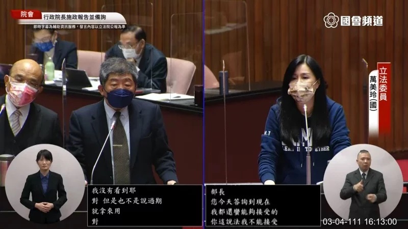 國民黨立委萬美玲今於立法院質詢行政院長蘇貞昌及衛福部長陳時中。圖/翻攝自國會頻道