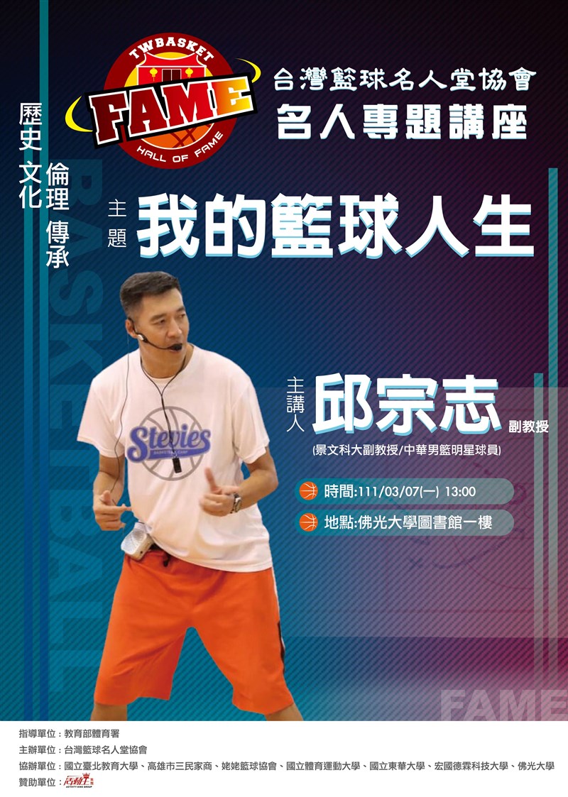 系列講座首站將選在佛光大學,找來中華職籃(CBA)時期名將邱宗志,他在選手時期入選過瓊斯杯、亞錦賽、亞運等國手,和鄭志龍、周俊三、朱志清、黃春雄等球星都是同期好手,轉當教練後也曾任中華輪椅男籃教練,籃球資歷豐富。