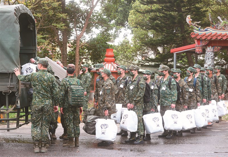 新制教召首梯人員,昨天在桃園市山腳國小報到,換裝後上軍卡車到營區,將完成十四天訓練。圖/曾吉松