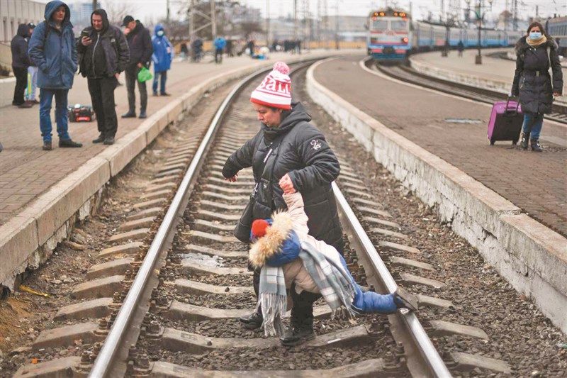 一名烏克蘭婦人四日帶著年幼的孩子穿越利維夫火車站的鐵軌趕路,孩子的步伐有些踉蹌。圖/法新社