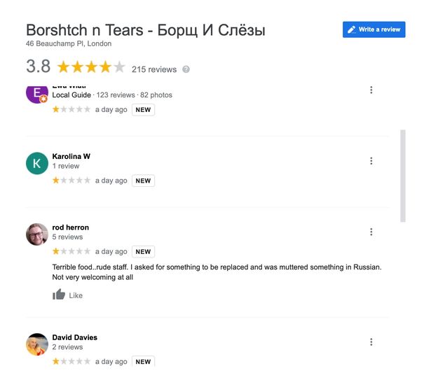 伊凡在餐廳評論寫道:「俄軍已經轟炸基輔和愛好和平的居民4天了。」另一則評論寫道:「走上街頭抗議,阻止兒童喪生。」