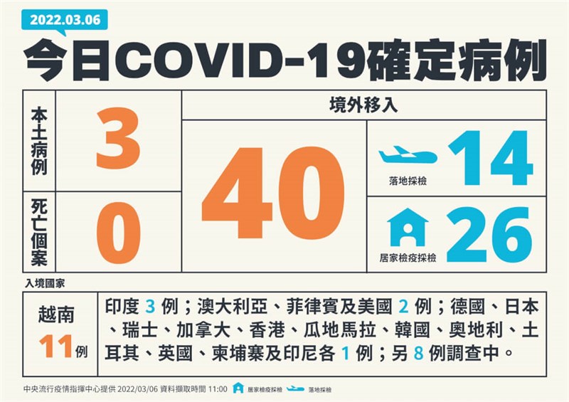 3月6日本土確診3例,40例境外移入,無死亡個案。圖/指揮中心提供
