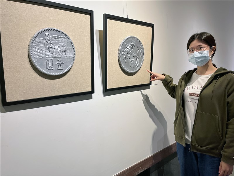 陳松以舊版台幣一元為主題的作品《一元復始》,讓觀者會心一笑。圖/台中市港區藝術中心提供