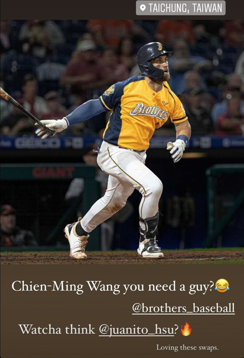 【記者張哲郢綜合報導】美國職棒費城費城人球星哈波(Bryce Harper)5日突發布限時動態,P上自己穿著中華職棒中信兄弟球衣的畫面,還向兄弟二軍投手教練王建民喊話「需要人手嗎?」,王建民今天也笑說,若哈波來台可以試一下臭豆腐。