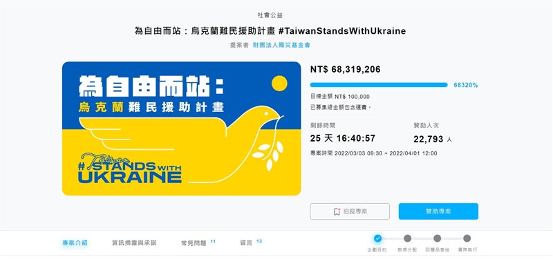 賑災基金會表示,烏克蘭捐款專戶累計達2.43億元,圖為基金會另於挖貝平台上發起的集資專案,到今天晚間7時已累計6800多萬元。圖/擷取自挖貝平台