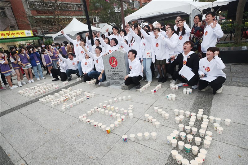 日本311大地震將滿11周年,在台日本留學生6日在淡水舉辦「謝謝台灣,日台友好,絆」活動,並在紀念碑前排出「謝謝台灣」字樣。圖/中央社