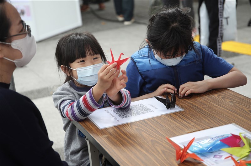 「謝謝台灣,日台友好,絆」活動6日在淡水舉辦,吸引小朋友參加活動、摺紙鶴祈福。圖/中央社