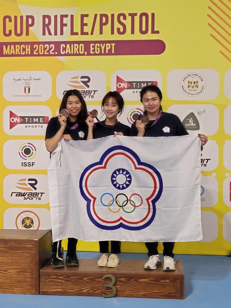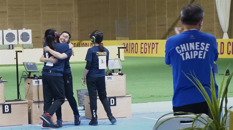 (左起)余艾玟、吳佳穎與田家榛組成的射擊女團,在世界杯埃及站中射下雙銅。圖/取自余艾玟臉書