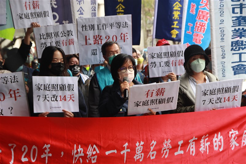 57個團體及工會請求修法,主張「勞工應比照軍公教,有薪放家庭照顧假」、「家庭照顧假應從一年7天改為14天」、「應放寬休假事由,家人需要照顧時皆可請假」,希望政府別再讓人民失望。