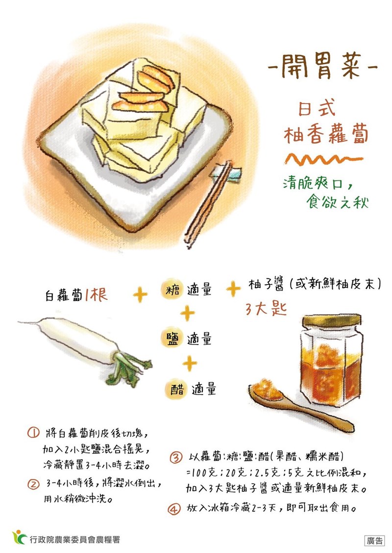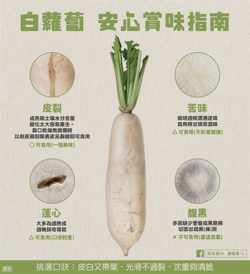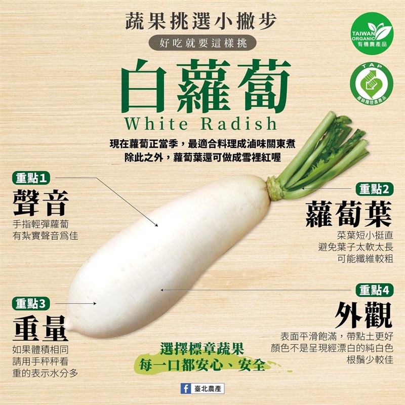 國產白蘿蔔正當季 4招選出味鮮肉美好滋味 |2022.03.07 語音朗讀 4389觀看次 字級 大 中 小 圖/123RF 【記者楊旻芳台北報導】現在正是國產白蘿蔔的盛產季,白蘿蔔有很多妙用,可以煮湯、做蘿蔔糕,還可以做成醃蘿蔔。只是挑白蘿蔔很有學問,不小心買回來的白蘿蔔又苦皮又粗,到底要怎麼選才能挑到味嫩鮮美的白蘿蔔呢?圖/行政院農業委員會白蘿蔔吃法多、營養多白蘿蔔含有豐富的膳食纖維,能促進食慾、幫助消化,更富含維生素C及鋅、鉀等各種營養,幫助提升免疫力。現在蘿蔔正當季,鮮甜美味並且有諸多吃法,不論是醃蘿蔔、滷蘿蔔、炒蘿蔔絲,還是煮一鍋鮮美的蘿蔔湯,每種料理皆能帶出白蘿蔔不同的風味。圖/農糧署白蘿蔔雖好,挑選卻有訣竅,不然可能煮起來的風味苦澀肉又老,影響風味。行政院農糧署列出4中挑白蘿蔔常見的問題「皮裂、苦味、蓬心、腹黑」,若白蘿蔔出現腹黑狀況不建議食用,應盡速丟棄。白蘿蔔如果出現「皮裂」,在表皮出現小裂縫,是因為在成熟期土壤水分含量變化太大,只要裂口乾燥無腐爛,使用削皮器刮除表皮及裂縫即可食用,不會影響風味。白蘿蔔在生長期遭遇逆境,會帶有一股「苦味」,可以食用不影響健康,卻會帶著一股苦味。「蓬心」現象為切面出現空洞大多為過熟或過晚採收導致的結果,切面無變質變色仍可食用。「腹黑」為切面出現藍黑色(條)斑,可能在生長期間缺少營養或感染黑腐病菌絲等原因,保險起見應盡速丟棄不可食用。好吃白蘿蔔,到底該怎麼挑?北農傳授挑選4大步驟,保證挑選出來的白蘿蔔超好吃!圖/臺北農產重點1:聲音手指輕彈蘿蔔,有紮實聲音為佳重點2:蘿蔔葉菜葉短小挺直,避免葉子太軟太長,可能纖維較粗重點3:重量如果體積相同,請用手秤秤看,重的表示水分多重點4:外觀表面平滑飽滿,帶點土更好,顏色不是呈現經漂白的純白色,根鬚少較佳 醃白蘿蔔食譜【日式柚香蘿蔔】圖/農糧署1、將白蘿蔔削皮後切塊,加入2小匙鹽混合搖晃,冷藏靜置3-4小時去澀。2、3-4小時後,將澀水倒出,用水稍微沖洗。3、以蘿蔔:糖:鹽:醋(果醋、糯米醋)=100克:20克:2.5克:5克之比例混和,加入3大匙柚子醬或適量新鮮柚皮末。4、放入冰箱冷藏2-3天,即可取出食用。 前一篇文章 性平法施行20年 57團體盼落實有薪家庭照顧假 下一篇文章 富邦捐3000萬援烏克蘭 紅會、展望會揭難民處境 熱門新聞 01小氣泡能量大2026.01.2002微細氣泡 用途也很多2026.01.2003贈春聯、福袋 新加坡佛光山送福到社區2026.01.2004學測落點預估 台大醫59級分2026.01.2005聯合國示警 全球水資源破產2026.01.2206【古德傳法】永明延壽與衢州天寧禪寺2026.01.2107星雲大師全集【傳記】百年佛緣─社緣篇 黃金不動道人心─談我不為金錢誘惑的想法 4 - 12026.01.2008友善失智 上錯菜卻贏得客人心2026.01.2009【王文靜看世界】 「家庭主婦」凱薩琳 把美國總統逼下台2026.01.2110澤倫斯基瑞士演說 控俄飛彈含台灣零件 2026.01.24 訂閱電子報 台北市 天氣預報 台灣一週天氣預報 相關報導 陸海警侵擾金門 海巡署強勢驅離蘇嘉全掌海基會 籲恢復兩岸交流挺1.25兆軍購 AIT:自由非免費海鯤號再現身 海測前做準備汽車與農產品 美要求開放市場台美關稅談判 鄭麗君今說明周折