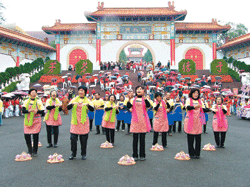 【人間社記者吳嚴儂大樹報導】「透早要出門,燒香拜佛祖,家裡準備好,出門做環保…」佛光大學資源回收隊員二十四日前往佛光山參加化裝遊行,於不二門前廣場表演客家民謠,博得觀眾喝采,從他們的肢體動作,看到佛光人「環保回收建大學」的那份堅持,與認真負責態度。(人間社記者吳嚴儂攝)
