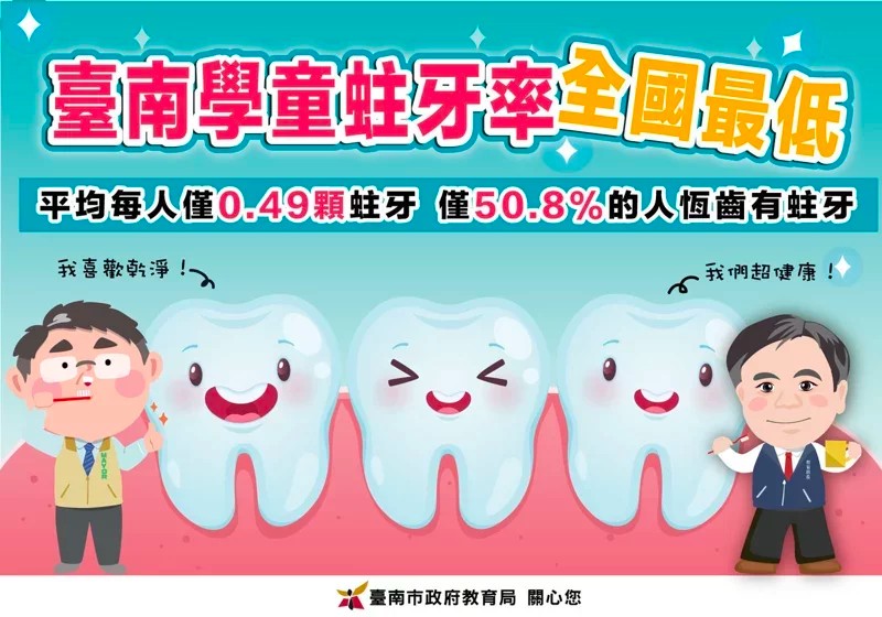 【本報台南訊】衛福部最新統計,台南市學生平均每人蛀牙顆數僅0.49顆為全國最低,且從2019年8月至去年連續2個學年度學校推動成效獲中央遴選為口腔保健特優,教育局表示,推動偏鄉學校口腔巡迴醫療服務,建立正確口腔保健知識,減少齲齒率,小朋友也影響家庭創造雙贏。