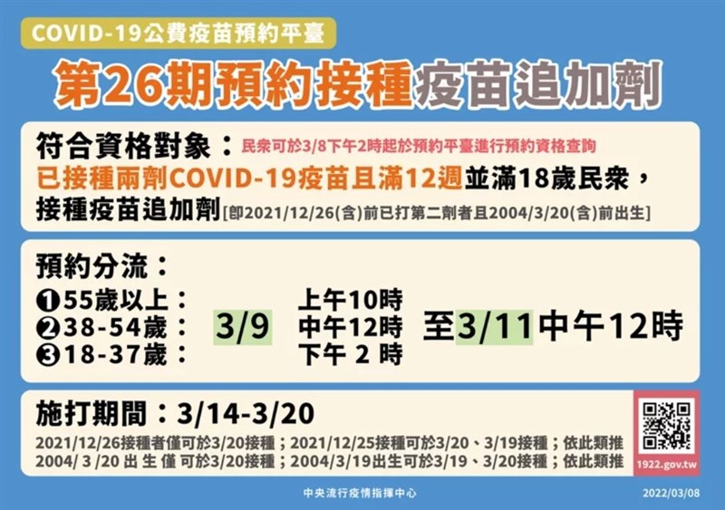 第26期新冠疫苗9日開放預約 供123萬劑 |2022.03.08 語音朗讀 693觀看次 字級 大 中 小 第26期疫苗9至11日中午12時開放民眾分流預約,開放去年12月26日前接種滿兩劑、滿18歲以上民眾預約接種追加劑,的疫苗約123萬劑。圖/侯永全 【本報台北訊】第26期疫苗9日開放民眾分流預約,預約時間為3月9日至3月11日。中央流行疫情指揮中心發言人莊人祥表示,公費疫苗平台於每周三至周五,本次開放去年12月26日前接種滿兩劑、滿18歲以上民眾預約接種追加劑,符合接種者約510萬人。提供的疫苗約123萬劑,AZ疫苗2.7萬劑、莫德納約89萬劑、BNT約24萬劑、高端6.7萬劑。莊人祥表示,本次提供「已完整接種兩劑COVID-19疫苗滿12周且滿18歲以上」民眾,預約接種疫苗追加劑,已達疫苗接種間隔尚未接種者,請儘速預約接種。目前也已提供民眾於各地方政府衛生局安排或指定的合約醫療院所預約接種,或至隨到隨打接種站進行接種。另請已於各地方政府衛生局安排或指定的合約醫療院所完成預約的民眾,仍依原已預約時段前往接種,無需再於預約平台重複預約。圖/中央社預約平台相關對象及期程說明如下:一、 施打時程:自2022年3月14日至3月20日。二、 符合資格對象:2021年12月26日前已完整接種兩劑疫苗且間隔滿12周之18歲以上民眾,即2004年3月20日前出生者,預約接種疫苗追加劑。三、 預約分流時程:(一) 55歲以上:3月9日上午10時至3月11日中午12時。(二) 38歲-54歲:3月9日中午12時至3月11日中午12時。(三) 18歲-37歲:3月9日下午2時至3月11日中午12時。圖/指揮中心民眾可於3月8日下午2時起於預約平台進行預約資格查詢,不再另外發送預約提醒簡訊,符合資格民眾請記得於預約時間進行預約,預約當日如遇啟動流量管制,亦請配合依序排隊耐心等候預約。預約平台僅提供民眾預約接種疫苗追加劑,民眾若有第一、二劑或基礎加強劑接種需求,請持接種紀錄(小黃卡)至各地方政府指定或安排合約醫療院所或衛生所預約,或至提供隨到隨打服務的接種站接種。前述醫療院所資訊,可至疾管署全球資訊網的「COVID-19疫苗接種院所」項下( https://reurl.cc/7eW0AQ ),利用「COVID-19疫苗接種院所」或「COVID-19疫苗接種院所地圖」,依各地方政府衛生局提供資訊連結預約接種。指揮中心提醒,請民眾前往接種COVID-19疫苗前,應備妥「COVID-19疫苗接種紀錄卡」及健保卡,並經醫生評估過往疫苗接種史及檢核接種紀錄後,提供民眾疫苗接種。另18歲至未滿20歲民眾,如自行前往接種,請持家長簽具的意願同意書,若由家長陪同前往接種,請本人與家長於現場共同簽署意願同意書。 前一篇文章 自己做觀音 3/12法寶堂細說觀音法門 下一篇文章 聯合國籲開設人道走廊 以利援助送達烏克蘭境內 熱門新聞 01苗栗漁港冒藍眼淚 縣府將檢測水質2026.03.3102祖厝大變身 王榮文打造農夫美術館2026.03.3103明德水庫蓄水量僅27% 今起供4停42026.04.0104星雲大師靈骨分燈日本 法燈長明2026.04.0105新生首次到校2026.04.0206【讓愛自由】纏繞與獨立之間2026.04.0207佛光會理監事會議 佛光精神深耕全球2026.03.3108東京櫻花滿開2026.04.01099公尺高恐龍 現身澄清湖2026.04.0110星雲大師靈骨分燈泰國 化益世人2026.04.02 訂閱電子報 台北市 天氣預報 台灣一週天氣預報 相關報導 海軍敦睦艦隊 進入巴拿馬運河中油高雄大林廠火警 環保局開罰桃機3航廈屋頂 設10公里天溝國民黨中常會 提名台中、澎湖、竹縣長中美並重 鄭麗文傳6月訪美景氣分數衝高 燈號連3紅