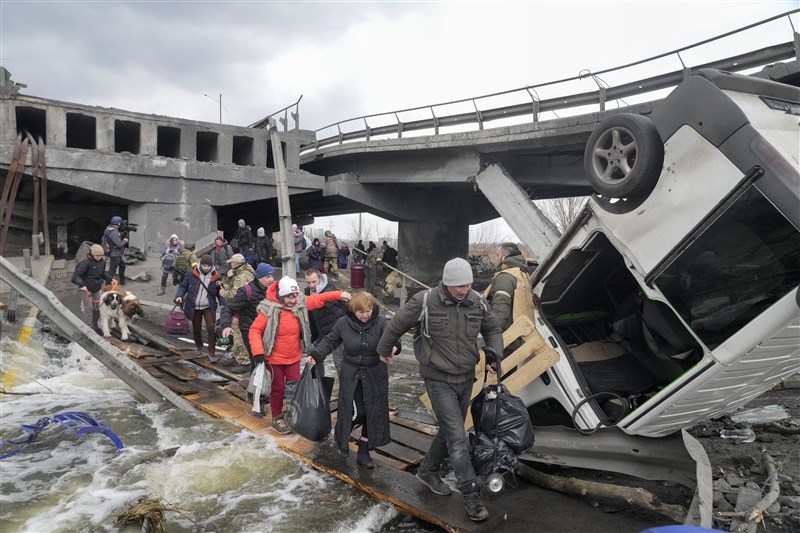 烏克蘭首都基輔近郊伊爾平民眾七日逃離家園時穿越一座遭炸毀橋樑。俄國七日再次宣布停火並建立數條人道走廊。圖/美聯社