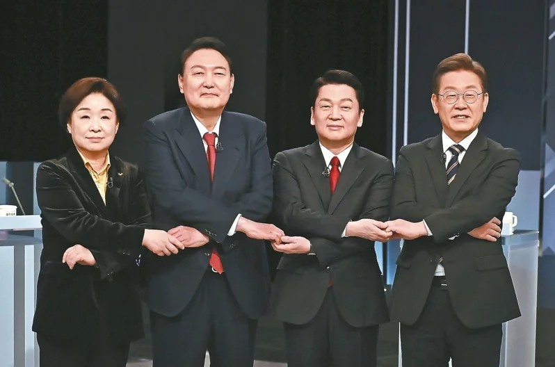 南韓總統大選二日舉行選前最後一場辯論會,候選人先禮後兵,由左至右依序是沈相奵、尹錫悅、安哲秀、以及代表執政黨的李在明,其中安哲秀在臨近投票日的3日宣布退選,轉為與尹錫悅同一陣線。圖/美聯社