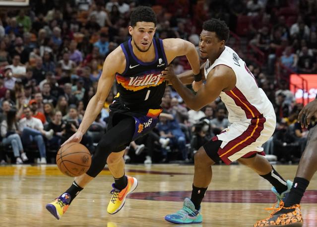 太陽射手布克(Devin Booker)因傷缺席4場後對熱火一戰回歸,不過太陽進入比賽較慢,首節曾14:25落後對手超過10分。