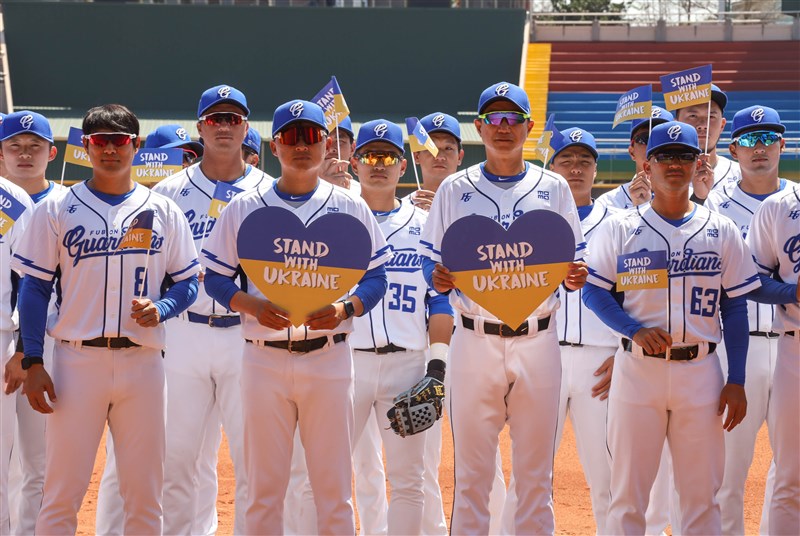 【記者曾博群台北報導】富邦悍將隊今日在嘉義市棒球場賽前進行賽前儀式,由富邦悍將一軍總教練丘昌榮帶領全體隊員共同列隊,手持「Stand with Ukraine」的旗幟,並呼喊口號「烏克蘭加油!」,為受戰火影響的烏克蘭人民加油打氣。