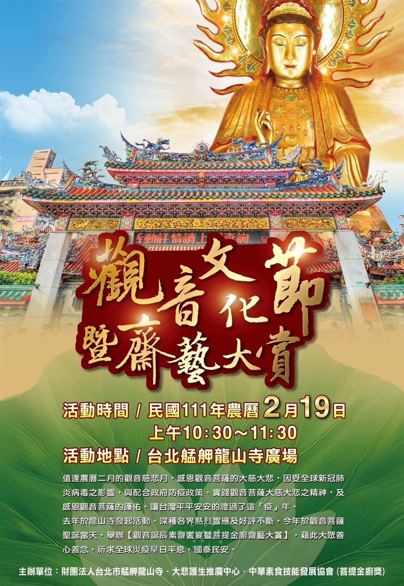 【記者楊旻芳台北報導】今年3月21日(農曆2/19)是觀世音菩薩聖誕,也是艋舺龍山寺重要的宗教節日,今年龍山寺特別舉辦「觀音文化節暨齋藝大賞」,聚集台灣108位大廚以「素食齋戒‧護生防疫」素菜恭祝菩薩聖誕,祝禱台灣平安走出疫情。