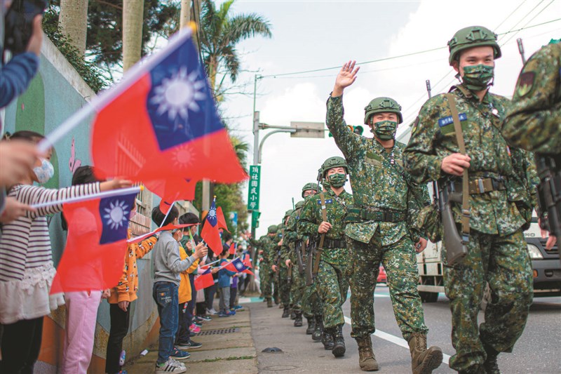 教育召集新制昨天邁入第六天,受召人員實施十公里行軍訓練,並結合行進間狀況設計,強化突發狀況處置與應變能力。圖為當地頂社國小的學生們在路旁揮舞國旗,替官兵加油打氣。圖/中央社