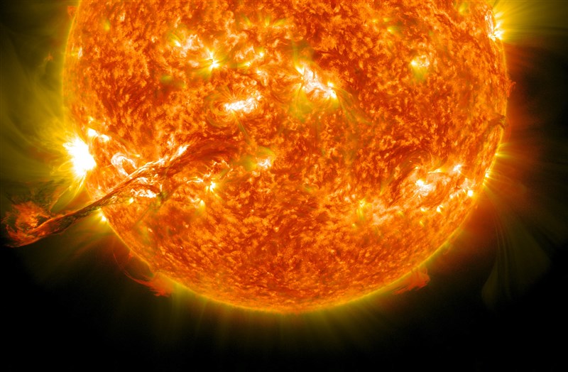 太陽表面愈來愈活躍,日冕物質大量噴發(拋射),中央氣象局長鄭明典說,「還好,方向沒正對地球!」。圖為日冕噴發。圖/NASA