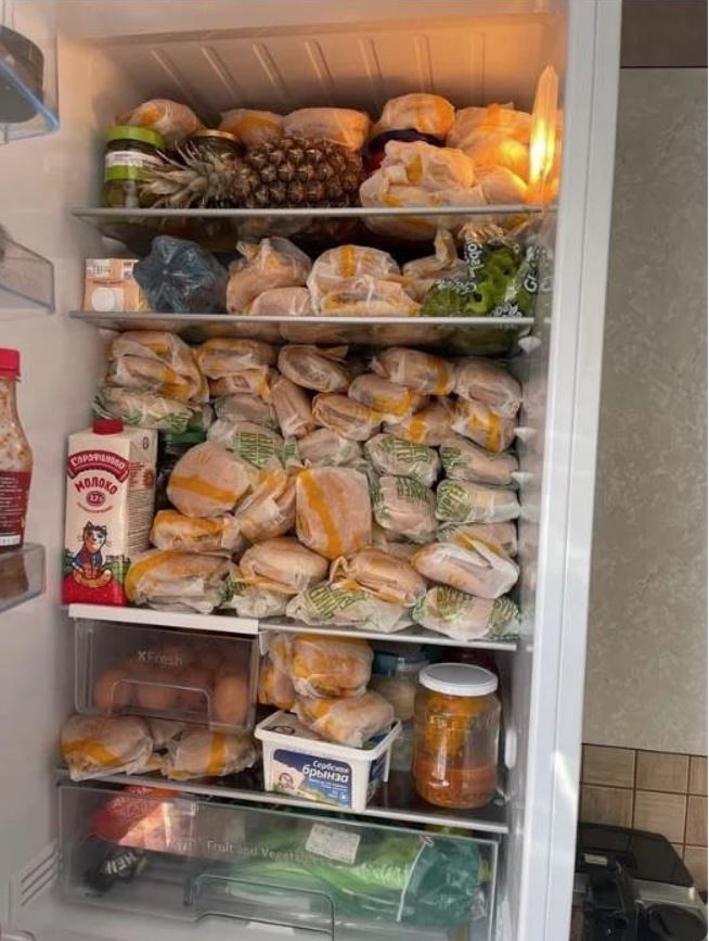 有國外網友分享俄國友人的冰箱塞滿麥當勞漢堡。圖/截自Reddit