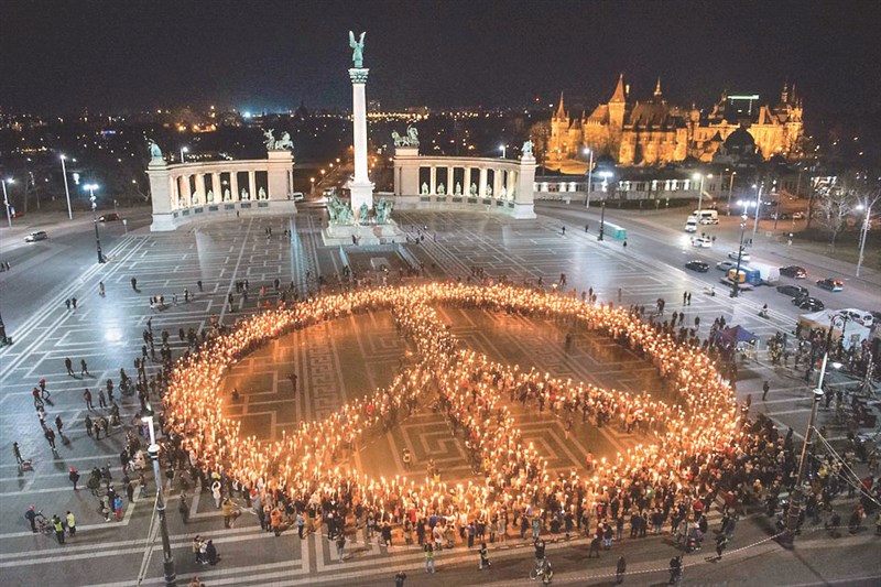 綠色和平組織,在匈牙利布達佩斯英雄廣場上示威遊行,民眾用燈光製作和平標誌。圖/美聯社