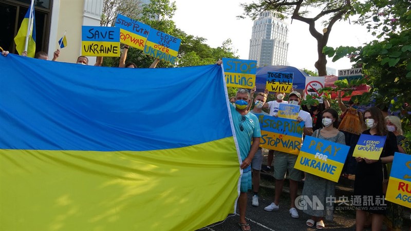 旅居泰國的烏克蘭人高舉各式反戰標語,希望各界關注烏克蘭的狀況。圖/中央社