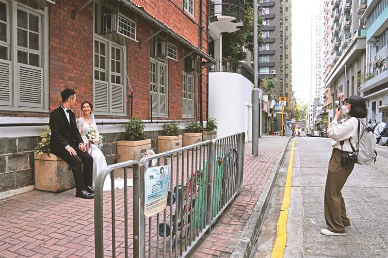 香港疫情嚴峻,一名攝影師戴著口罩,13日在街道為新人拍攝婚紗照。圖/美聯社