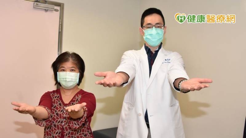 陳彥中醫師(右)表示,「手、嘴、說」口訣中,「手」- 雙手平舉,看有沒有單側瞬間無力狀況發生。圖/健康醫療網