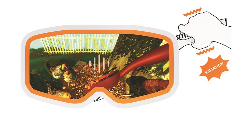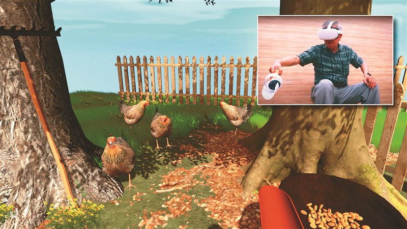 除了詢問醫護人員的意見,也邀請高齡使用者進行測試,長輩在餵雞的虛擬實境過程中,沉浸在視覺的高擬真模擬畫面、場景環繞著動物鳴叫聲,還有手持觸覺套件敲擊到物品的撞擊聲、鏟子震動及撈飼料的重量感等,都給予使用者真實的體驗感受,團隊將持續優化原型設計,希望未來能提供更多體驗場景。
