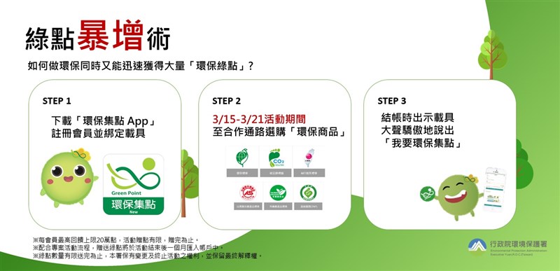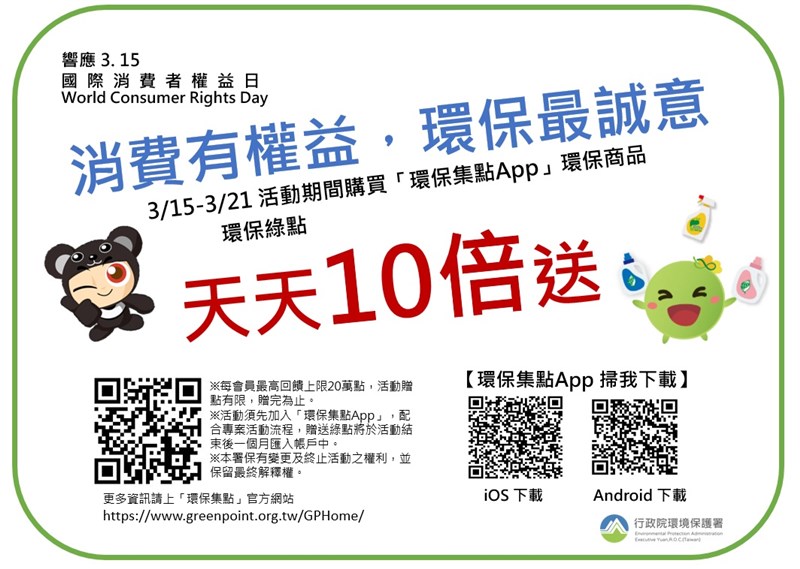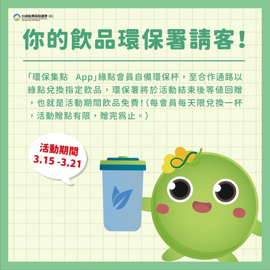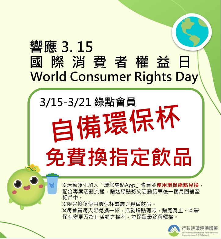 響應315國際消費者權益日 自備環保杯喝飲料免費 |2022.03.15 語音朗讀 1323觀看次 字級 大 中 小 圖/行政員環境保護署 【記者楊旻芳台北報導】為鼓勵自備環保杯,響應3月15日「國際消費者權益日」,環保署自3月15日起至3月21日為期一周推出「綠點會員自備環保杯,免費兌換指定飲品」,綠點會員自備環保杯到7-11及全家以綠點兌換指定飲料,環保署等值回贈點數;另外消費者參加綠點會員購買環保商品回饋綠點10倍,共同推動全民綠生活!環保署響應綠色消費,鼓勵全民綠生活,「環保集點App」綠點會員只要在期間內自備環保杯至「環保集點App」合作通路(統一超商7-11、全家便利商店),以綠點兌換指定飲品(限兌換須使用環保杯盛裝之指定現做飲品),期間兌換的點數,環保署將在活動結束後等值回贈,也就是活動期間飲品免費!(每會員每天限兌換一杯,活動贈點有限,贈完為止。)圖/行政員環境保護署新加入或綠點不夠的會員怎麼辦?新加入的會員想快速集綠點,註冊後「填寫個人基本資料」即可獲得500綠點,另外也可以使用「推薦分享功能」邀請朋友成功加入,輸入推薦碼可贈2000綠點。圖/環保集點app環保署同時也提供了迅速累點方案,推出「消費要權益,環保最誠意-購買環保商品,綠點天天10倍回饋」,活動期間只要加入會員而且購買「環保集點App」合作通路上的「環保商品」,即可獲得「10倍」的環保綠點回饋(每會員最高回饋上限20萬點,活動贈點有限,贈完為止。),等於消費100元獲得1,000點綠點,點數可以在合作通路兌換各式各樣的環保商品還可以折抵綠色消費,每100點可折抵新台幣1元!圖/行政員環境保護署圖/行政員環境保護署台灣人愛喝手搖飲、咖啡,光是2020年就用上20億個1次性飲料杯。環保署為鼓勵綠色消費,推出消費回饋活動,希望帶動綠色經濟、擴大綠色消費,同時讓民眾對於隨身攜帶「環保商品」更加熟悉。環保署再次強調做環保其實很輕鬆、很簡單,改變從消費習慣做起將環保意識實踐在生活中,請大家一同響應「全民綠生活」為地球盡一份心力! 前一篇文章 手機滑不停恐是成癮! 4招改善過度沉迷 下一篇文章 新北連3年補助 800名建教生受惠 熱門新聞 01法全票通過 掠奪文物歸還中國2026.04.1702【詩】 鐮刀俠2026.04.2103勞動部將研議 勞退舊制移入新制2026.04.1804【詩】靜寂 2026.04.1705普門品交響清唱劇妙法之歌 5月12日中山堂首演2026.04.1706補鈣最佳時機 晚餐後或睡前1小時2026.04.1707普門寺愛書人行佛 探討社會議題 2026.04.1808佛光山開山60周年 傳授三壇大戒2026.04.2009南投補助洗冷氣 估減碳排3.3萬噸2026.04.1810用說話鍛鍊大腦2026.04.18 訂閱電子報 台北市 天氣預報 台灣一週天氣預報 相關報導 第18屆兩湖論壇 南投登場總統訪史瓦帝尼 臨時喊卡陸惠台措施 商總:利民就該開放台灣引領轉型AI Google肯定天龍演習 揭密機艙美議員籲立院 通過國防預算