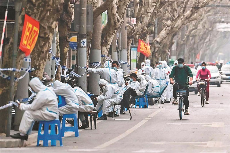 上海近日新冠疫情升溫,穿著防護裝的檢測人員,14日在實施防疫封鎖的區域旁歇息。圖/法新社