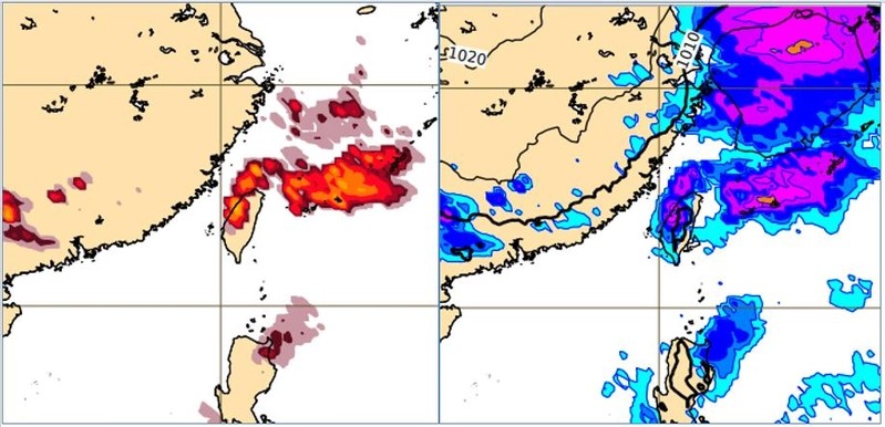 歐洲模式模擬18日2時閃電頻率(前6小時)圖顯示,明晚、周五晨中部以北局部地區有春雷機率(左圖);同時的降雨量模擬圖顯示,明晚、周五晨有較大雨勢發生(右圖)。圖/取自「三立準氣象.老大洩天機」專欄