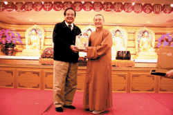 【人間社記者湯明珠三重報導】三重禪淨中心社教館暨讀書會聯合開學典禮,二日在一片歡樂、書香洋溢中,熱烈展開,監寺覺輝法師代表常住致贈二百套《金玉滿堂》—星雲大師一生弘法的圖文教材及《佛光山開山四十周年紀念特刊》給三重市各國民中學老師及圖書館,由市長李乾龍代為接受。