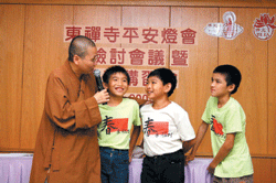 馬來西亞佛光山總住持覺誠法師,對全體義工在籌辦過程中的辛苦付出,全力實現制定的目標,表示肯定和讚許,為這些辛勞的義工加油與鼓舞,並期望集思廣義為明年的平安燈會再接再厲;隨後頒發「五年燈會發心義工獎」及「燈會義工表揚獎」,場面溫馨。(人間社記者王保淋攝)