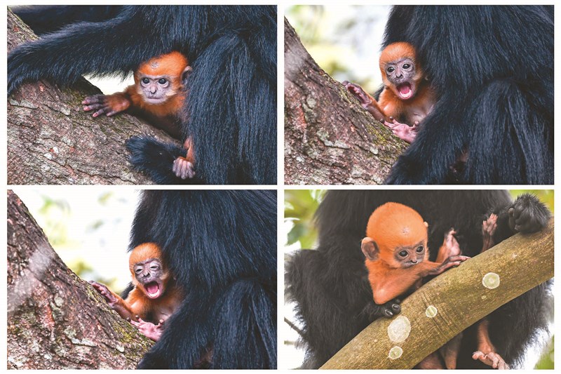 貴州麻陽河國家級自然保護區管理局觀測發現,近日,保護區新出生兩隻黑葉猴寶寶,毛色呈金黃色,幾個月後黑葉猴寶寶毛髮將逐漸變成黑色。
