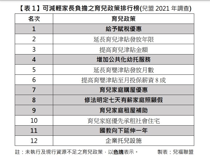 根據兒盟《2021 年學齡前育兒家庭現況與需求調查》則發現,對育有6歲以下幼兒的家庭來說,減輕家長育兒負擔「最有感」的政策排名,除了