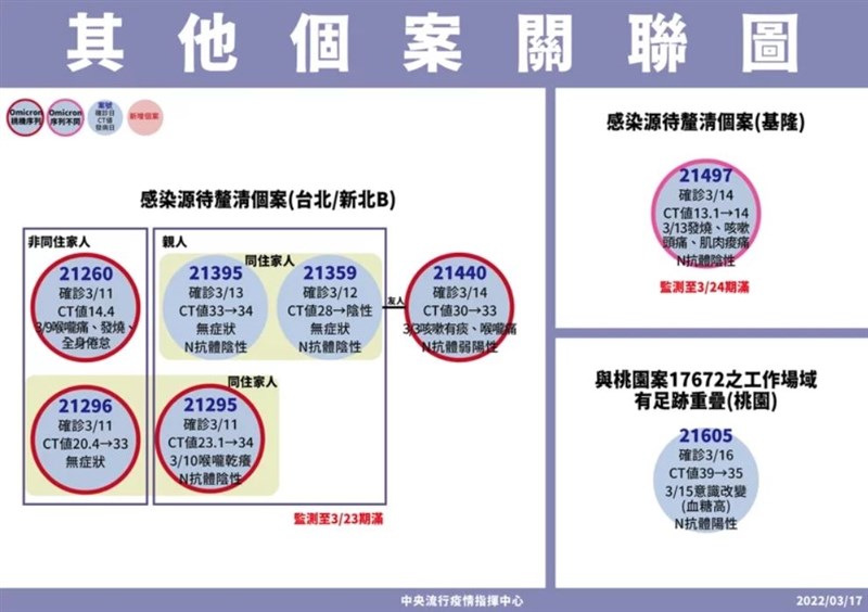 國內現已累計17條Omicron傳播鏈等不同序列傳播鏈,包含11起BA.1傳播鏈、6起BA.2傳播鏈包括桃機防疫人員、高雄港群聚、高雄引水人、桃機航警、宜蘭境外移入家庭群聚,加上今天定序出爐的五分埔確診女性。