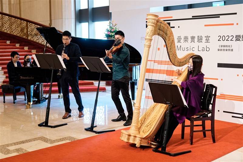 國家交響樂團豎琴首席、愛樂實驗室音樂輔療師解瑄(右)攜手音樂家們參與「穿樂時光深耕計畫」,期望讓更多長輩都能有機會與音樂藝術同樂。圖/國家交響樂團提供、鄭達敬攝