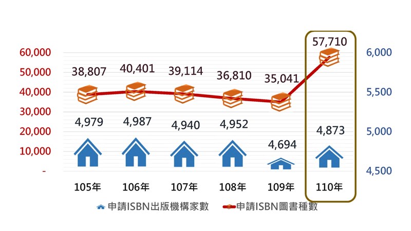 報告中指出,去年出版機構總計有4,873家申請新書ISBN,出版新書(含電子書)計57710種,較前年增加22669種,新書量創歷年新高,而且圖書資料類型更加多元,包括電子書及有聲書都大幅成長。