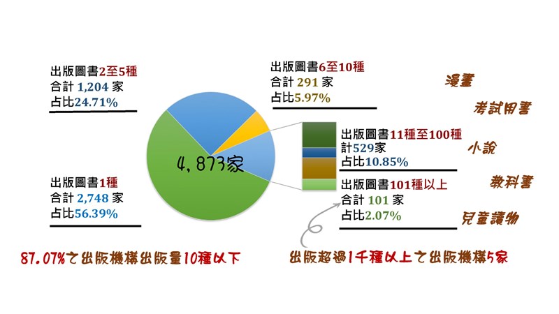 報告中也顯示,從出版機構的出版量規模統計,台灣小型出版社數量居絕對多數,有87.07%的出版機構出版新書的數量不超過10種,但大型出版社則在去年更為活躍並帶動整體出版量能,在前年出版量超過100種以上的出版機構僅45家,去年則攀升至101家,其中出版量超過1千種以上的出版機構有5家,大型出版社出版量占比也上升了23.65%。