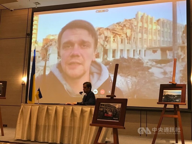 烏克蘭駐泰國代辦亞歷山大18日在曼谷舉行記者會,現場連線了人在烏克蘭日托米爾的一位民眾,以影像方式呈現日托米爾被轟炸過後的景象。圖/中央社