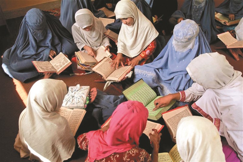 阿富汗女性中學生下周可重返校園。圖為阿富汗女子在當地神學院學習閱讀《古蘭經》。圖/美聯社