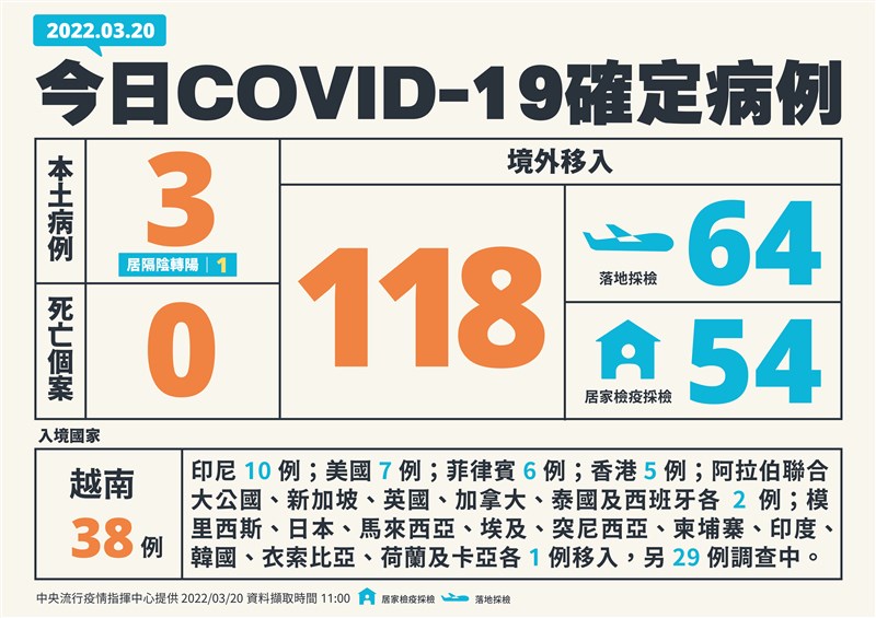 【本報台北訊】國內今新增121例新冠確定病例,分別為3例本土個案及118例境外移入,境外移入創次高。其中64例為航班落地採檢陽性;確診個案無新增死亡。